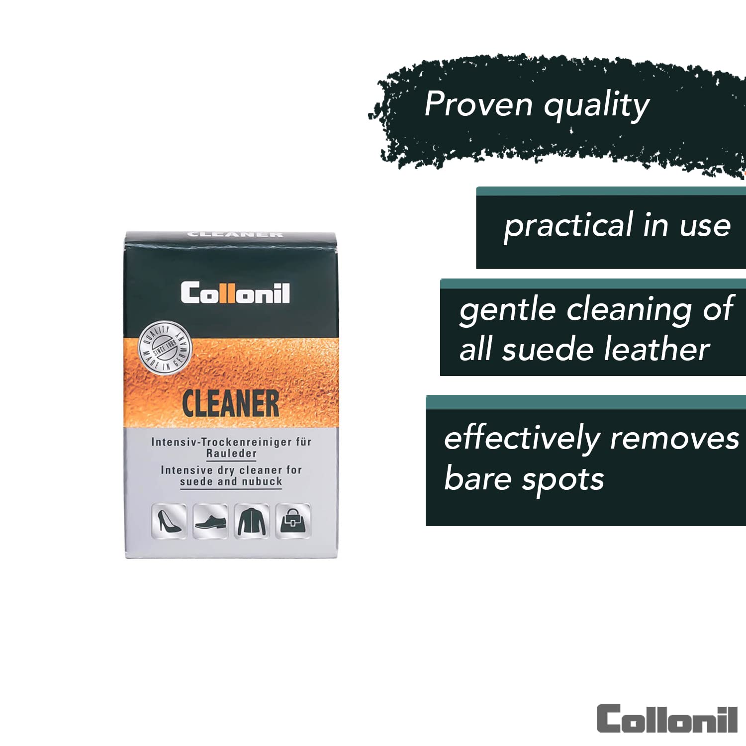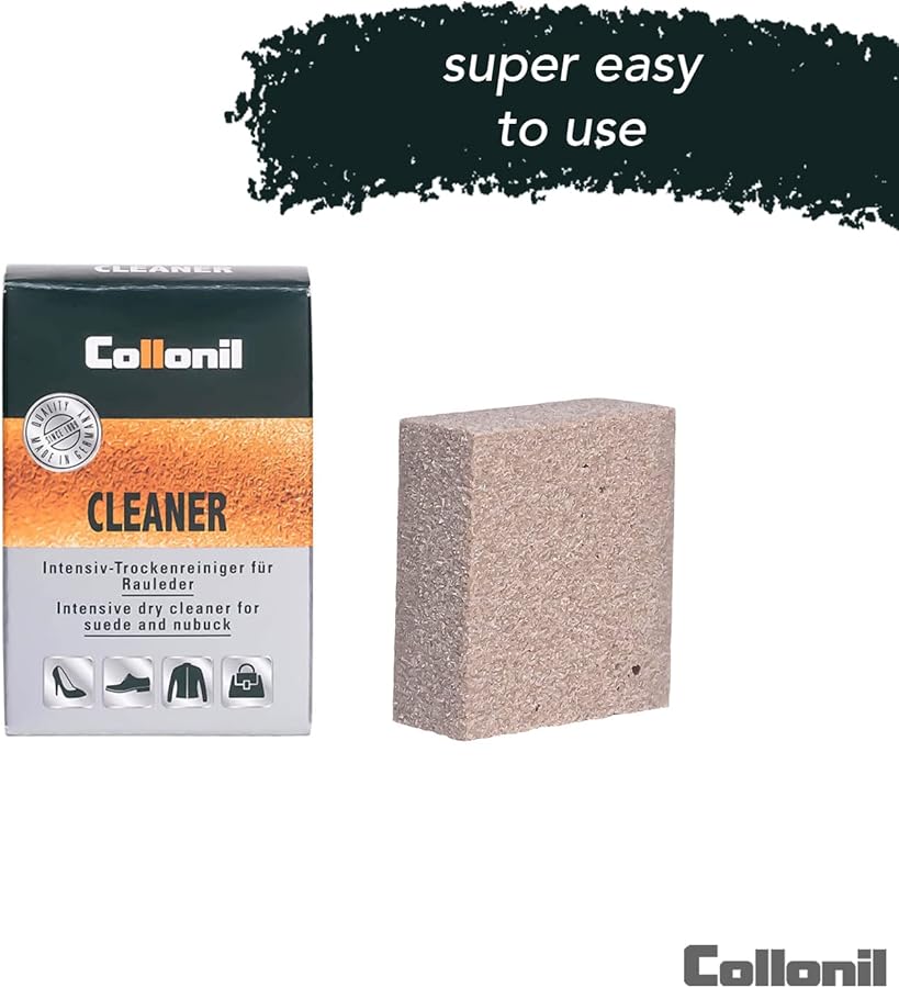 COLLONIL CLEANER: Специјална гума за суво чистење на велур кожа. Ефикасно ги отстранува дамките на површината од велур кожата. Важно е да се избегне примена на силен притисок врз велур кожата за време на процесот на чистење за да се спречи какво било потенцијално оштетување на материјалот.